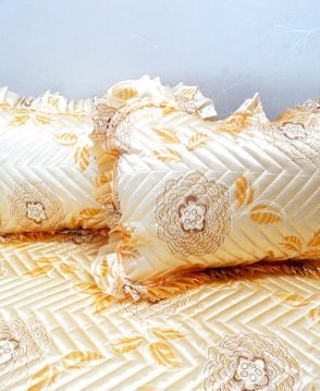 Кувертюра за спалня Слънчево цвете е изработено от плат сатен. Капитонирана е по метода на ултрасоник прошиване с нетъкан текстил, което придава плътност и красота на кувертюрата. Къдравите драперии по дължината на покривалото и декоративните калъфи за възглавници са допълнителен нежен акцент към декора на леглото. Едноцветен стилен цвят с малко забележими мотиви от цветя.