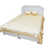 Кувертюра за спалня Слънчева сфера е изработено от плат сатен. Капитонирана е по метода на ултрасоник прошиване с нетъкан текстил, което придава плътност и красота на кувертюрата. Къдравите драперии по дължината на покривалото и декоративните калъфи за възглавници са допълнителен нежен акцент към декора на леглото. Едноцветен стилен цвят с малко забележими кръгове със златни нишки.