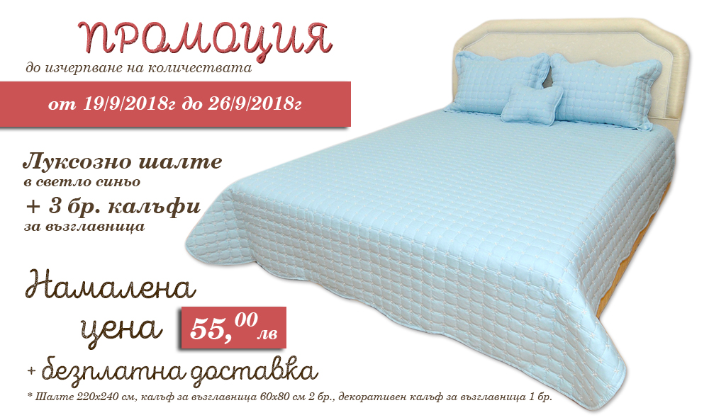 Представяме ви ПРОМОЦИОНАЛНА оферта на най-харесваните покривала за спалня с размер 220х240 см. ДВА ЦВЯТА от тях ще бъдат с намалени цени, а куриерската такса ще бъде за НАША СМЕТКА. Офертата ще важи за срок от една седмица.